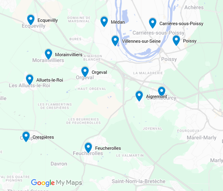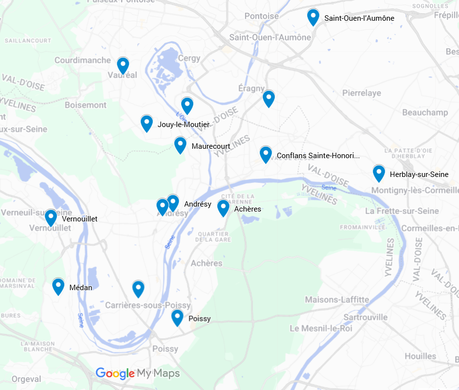 Conflans Sainte-Honorine, Orgeval, Achères, Aigremont, Andrésy, Boisemont, Carrières sous Poissy, Cergy,Chambourcy,Chanteloup les vignes,Courdimanche, Crespières, Eragny, Feucherolles, Jouy-Le-Moutier, Les Alluets-le-Roi, Maurecourt, Medan, Morainvilliers, Pierrelaye, Triel sur Seine, Herblay, Le Pecq, Maisons Laffitte, Poissy, Saint-Germain en Laye, Saint Ouen l’Aumône, Vaux sur Seine,Vernouillet,Verneuil sur Seine, Villennes sur Seine et plus loin sur devis.