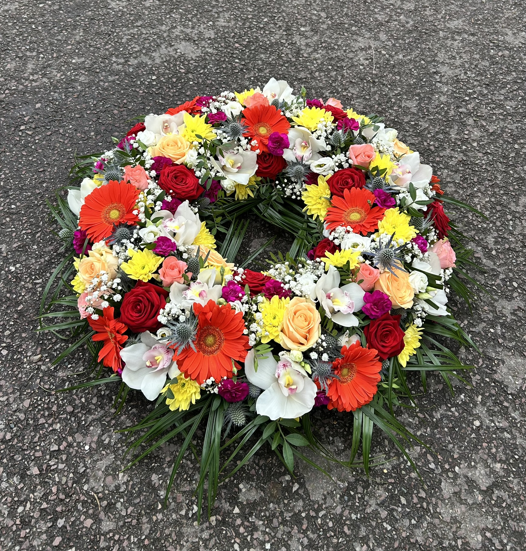 Nos compositions florales de deuil sont confectionnés par nos soins et sont uniques. Les photos ne sont pas contractuelles. Suivant les stocks en magasin les fleurs non essentielles pourront être remplacer.