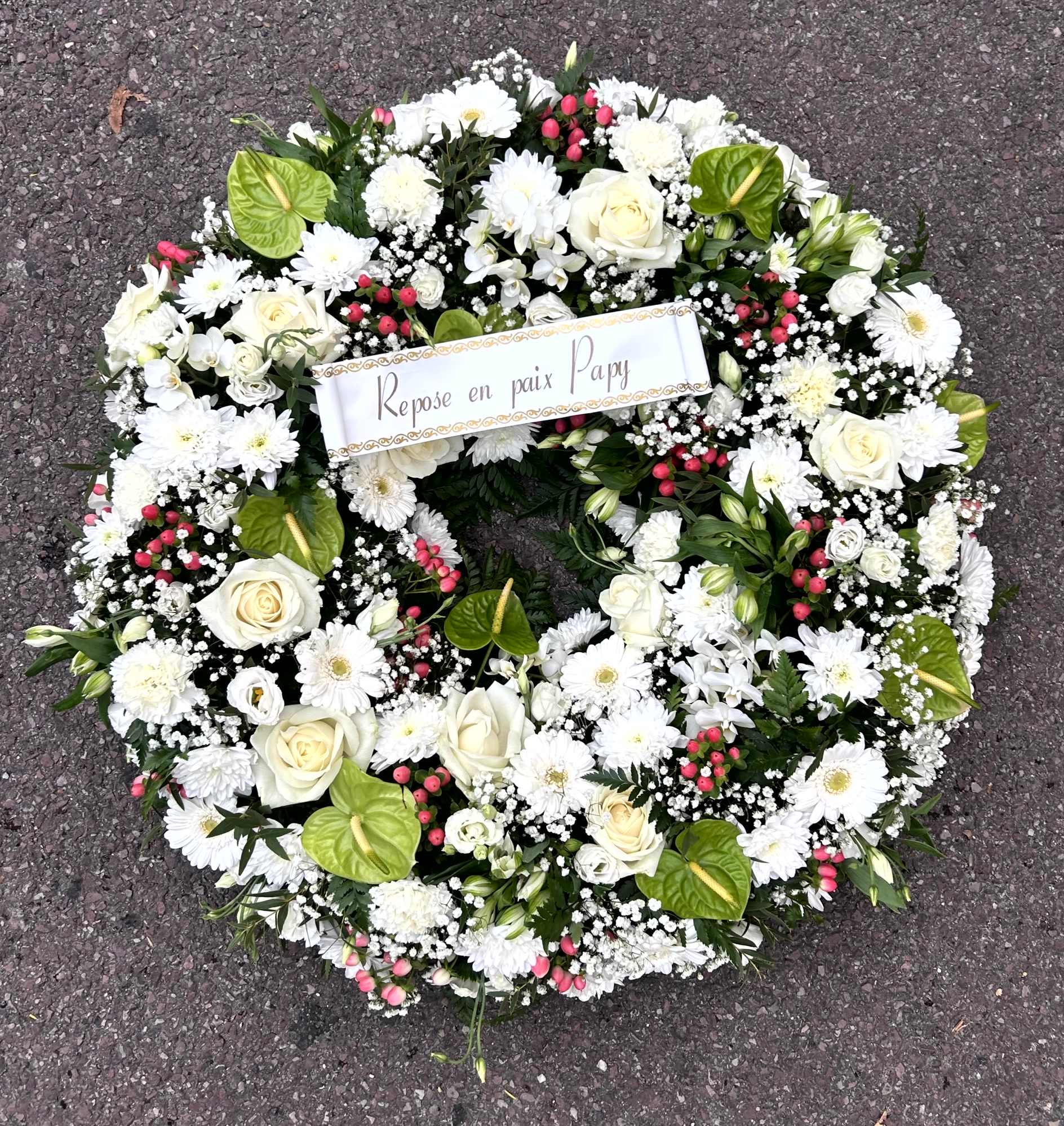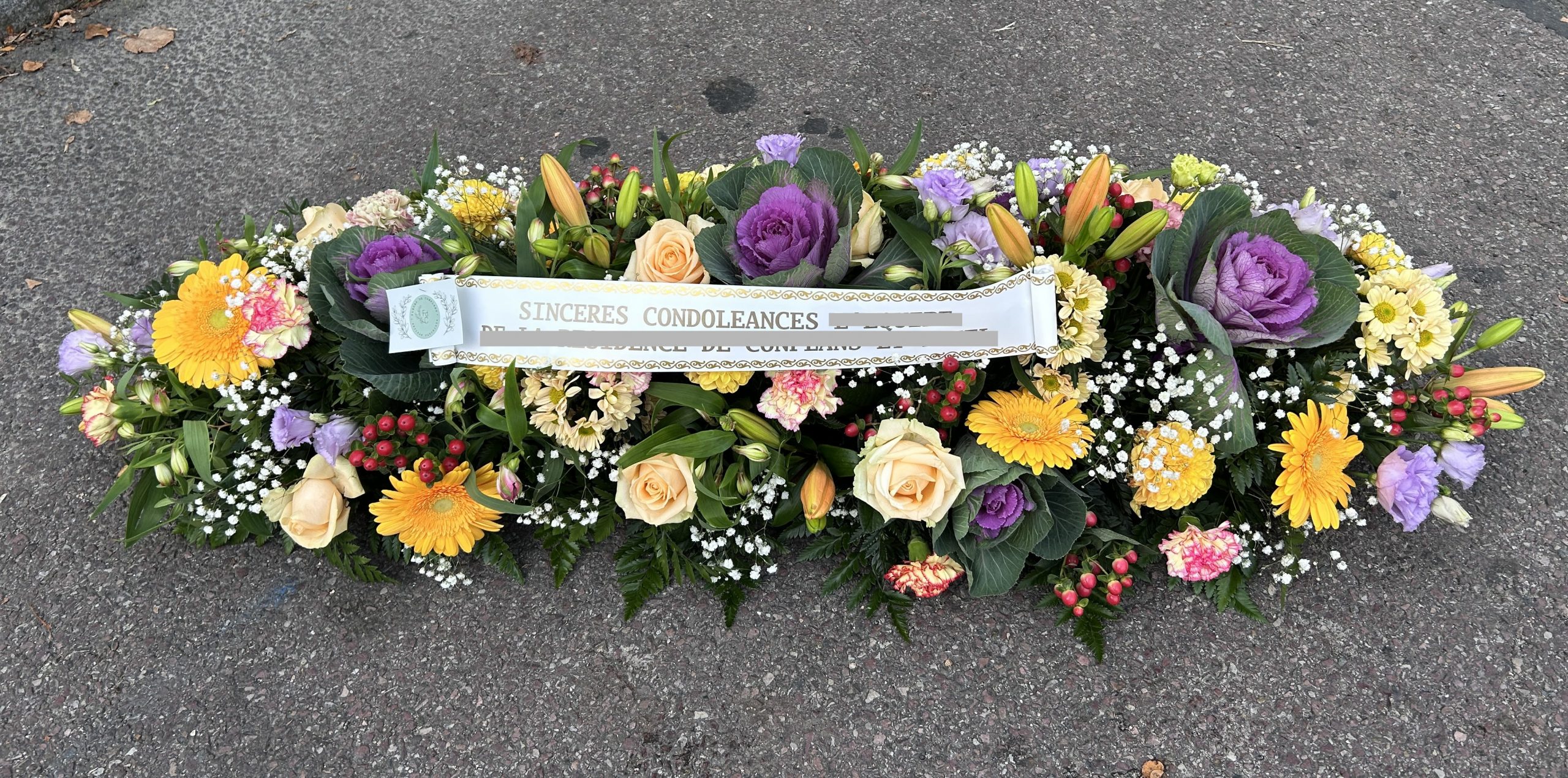 Nos compositions florales de deuil sont confectionnés par nos soins et sont uniques. Les photos ne sont pas contractuelles. Suivant les stocks en magasin les fleurs non essentielles pourront être remplacer.